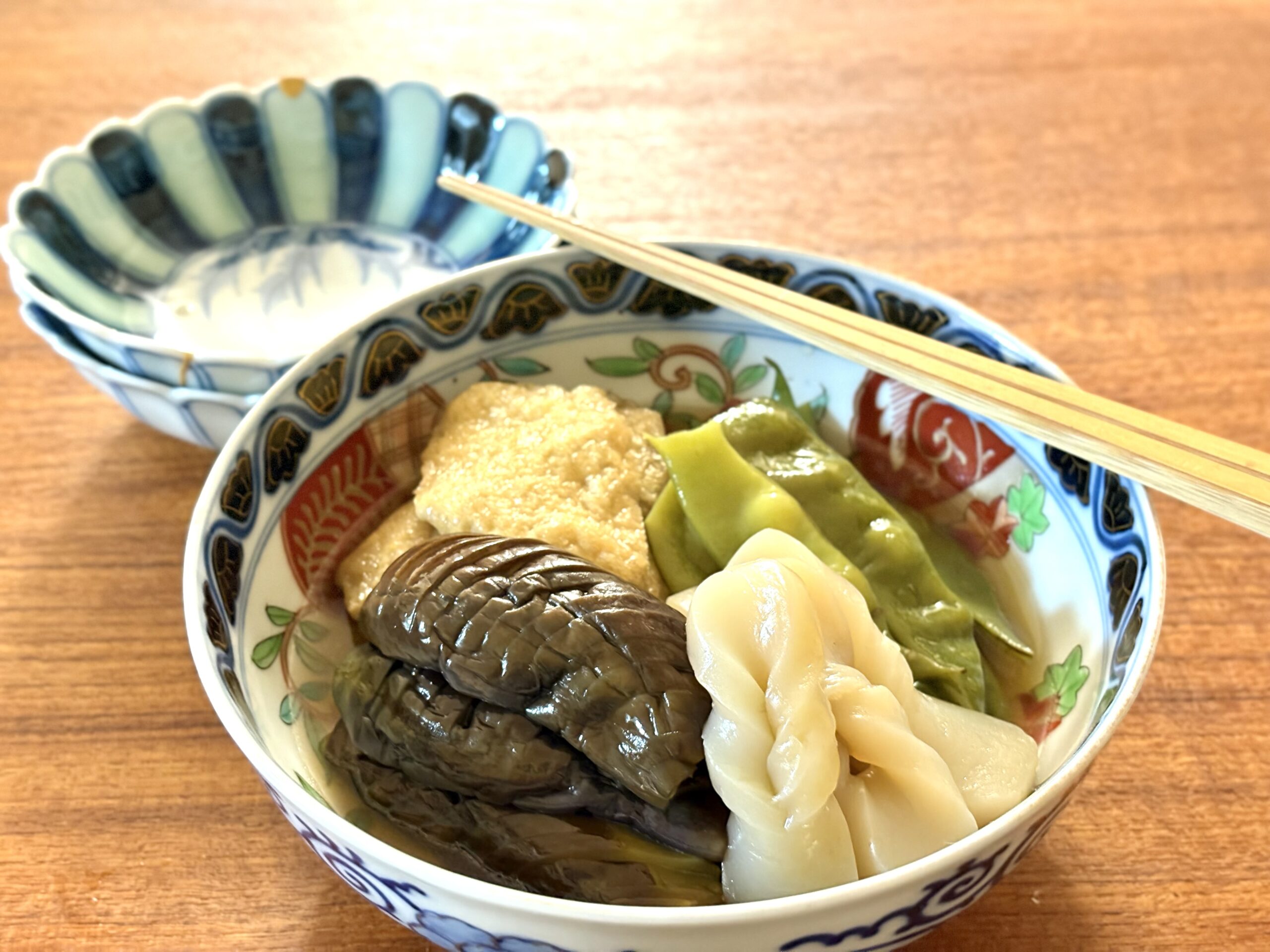 副菜は茄子とモロッコインゲンで煮物を。お揚げやこんにゃくも入れた我が家の定番料理です。